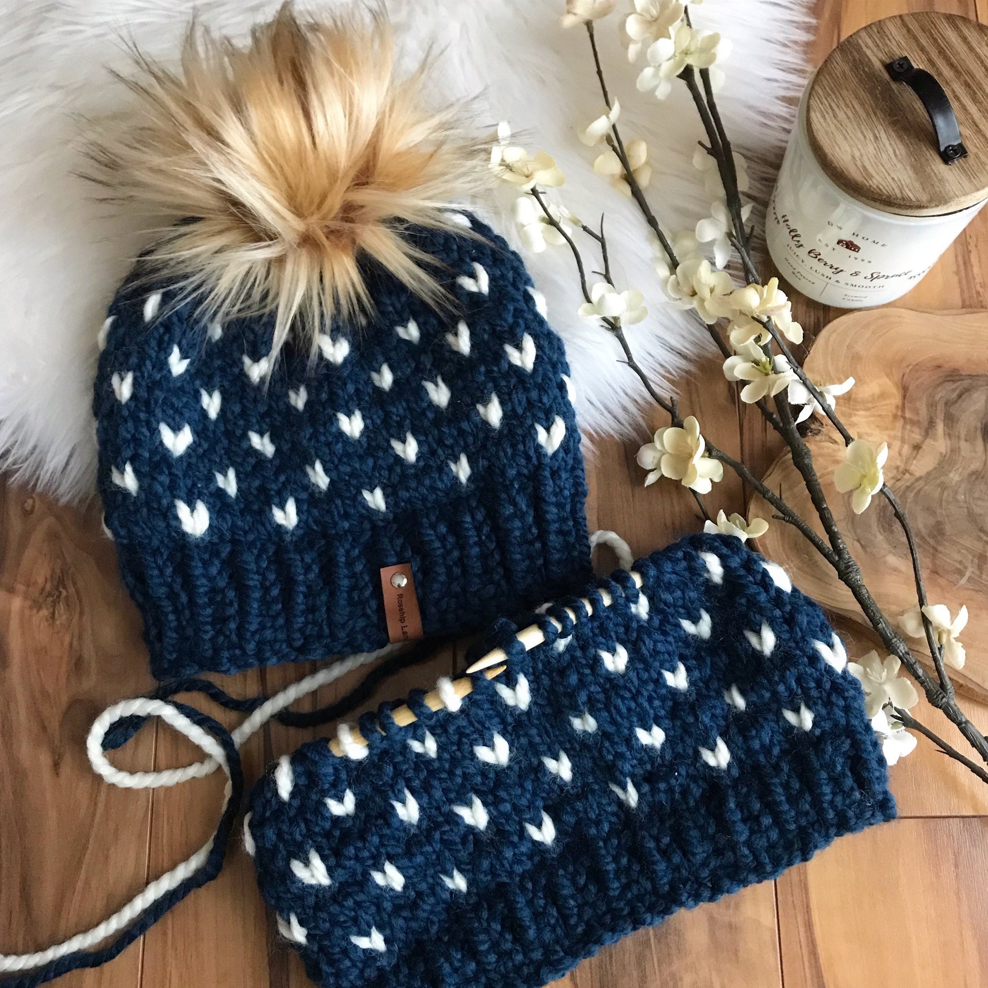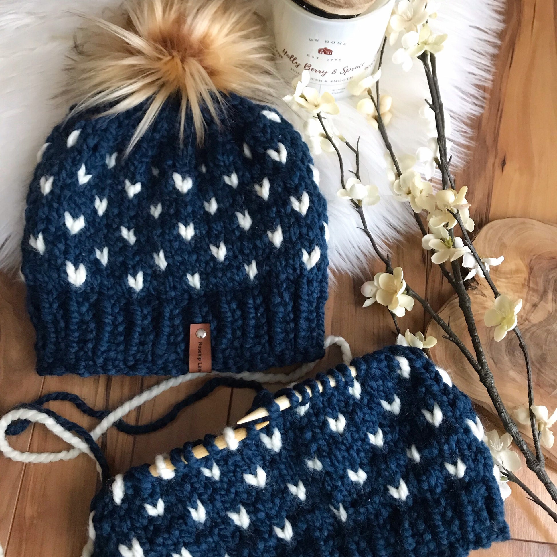 DIY Knitting Pattern Classic Women's Fair Isle Heart Print Beanie Hat and Cowl Scarf Set, Women's DIY pattern Pompom Hat Cap Toque
